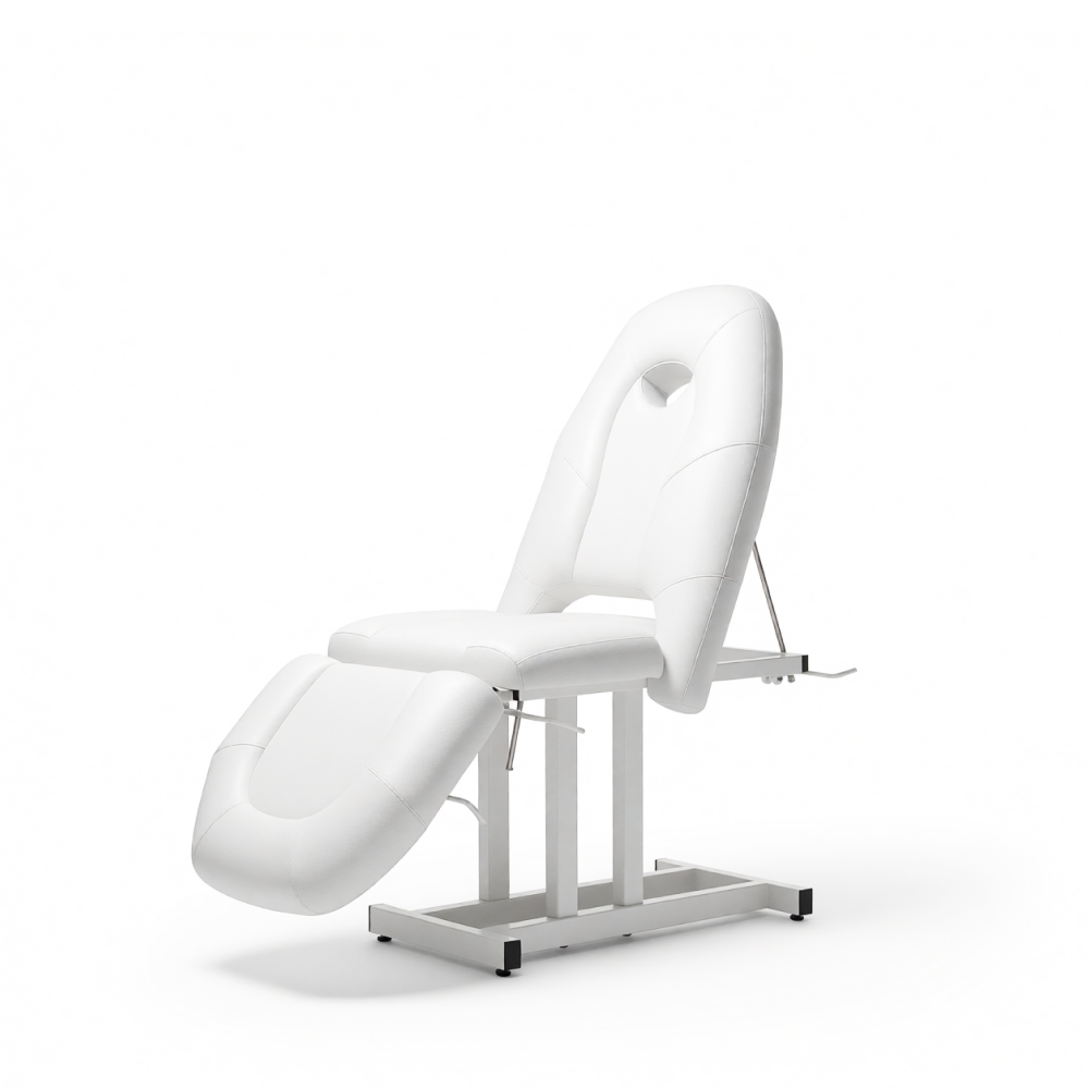 Фиксация происходит при помощи механического замка, что позволяет надежно закрепить конструкцию в удобном для клиента и мастера положении. Благодаря отсутствию подлокотников, модель кресла получила широкий матрас, на котором с легкостью разместится клиент любой комплекции. В горизонтальном положении кресло образует ровную поверхность, без ощутимых стыков.