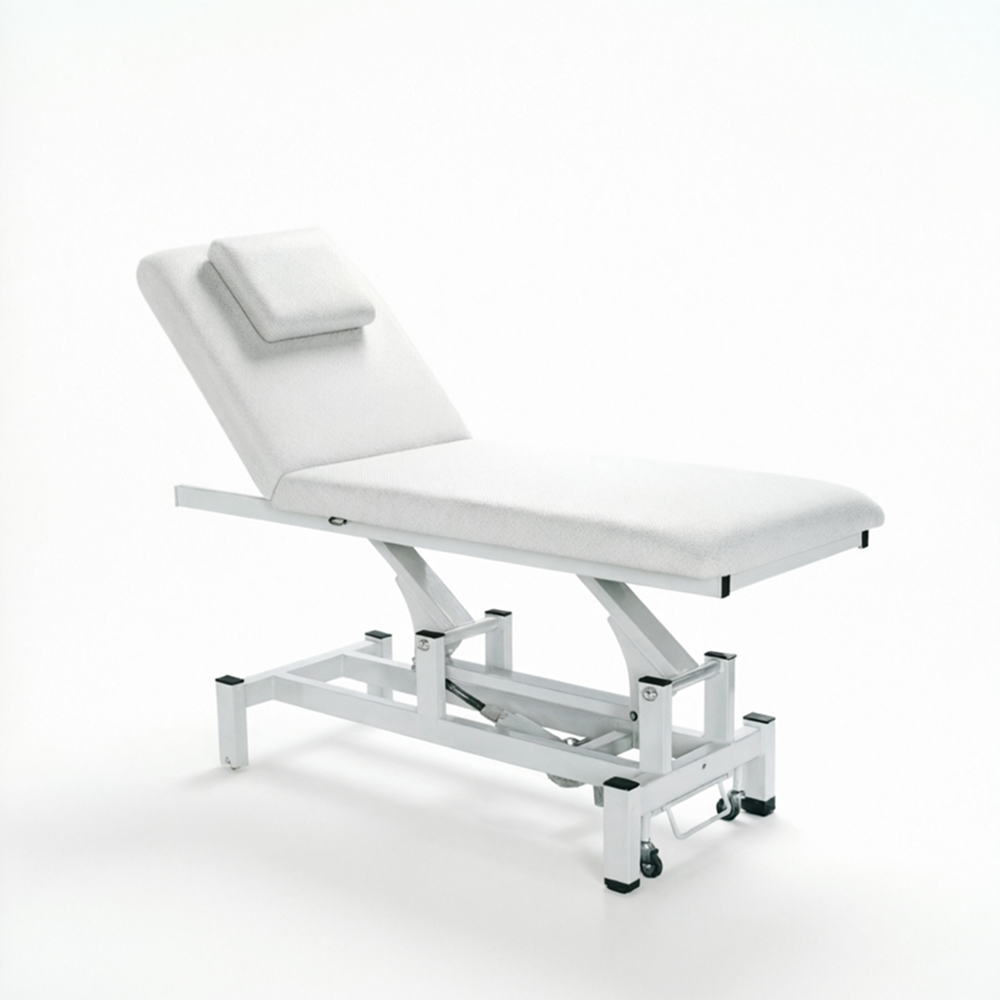 Электрическая кушетка. Один мотор для регулировки высоты, спинка регулируется механически. Подголовник с отверстием для лица.