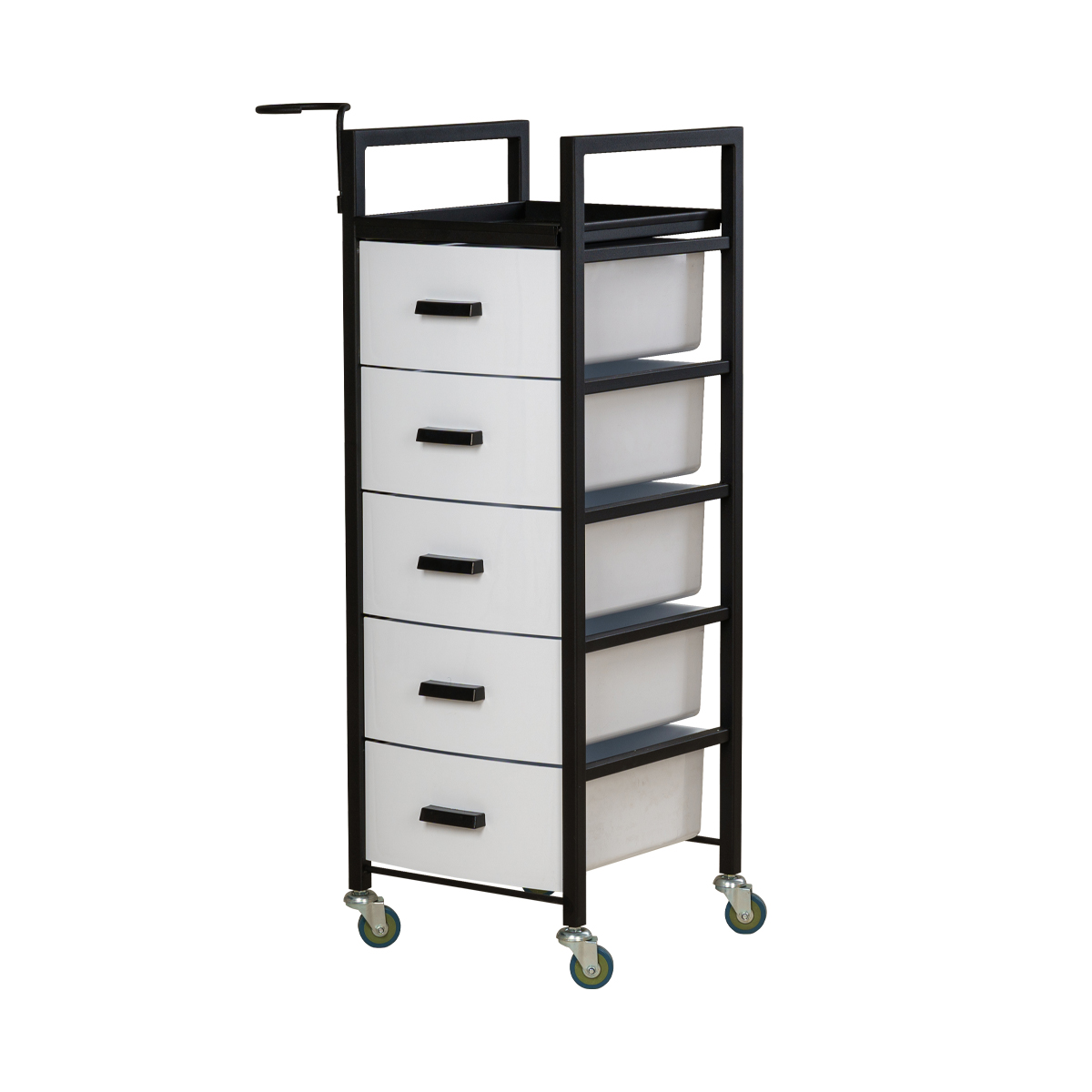 Для принадлежностей в парикмахерской тележке есть пять выдвижных ящиков. Верхняя полка позволит мастеру держать под рукой инструменты, необходимые во время работы с клиентом. На боковине установлен практичный фенодержатель. Вращающиеся колесики обеспечивают плавное и практически бесшумное перемещение оборудования в пределах рабочей зоны.