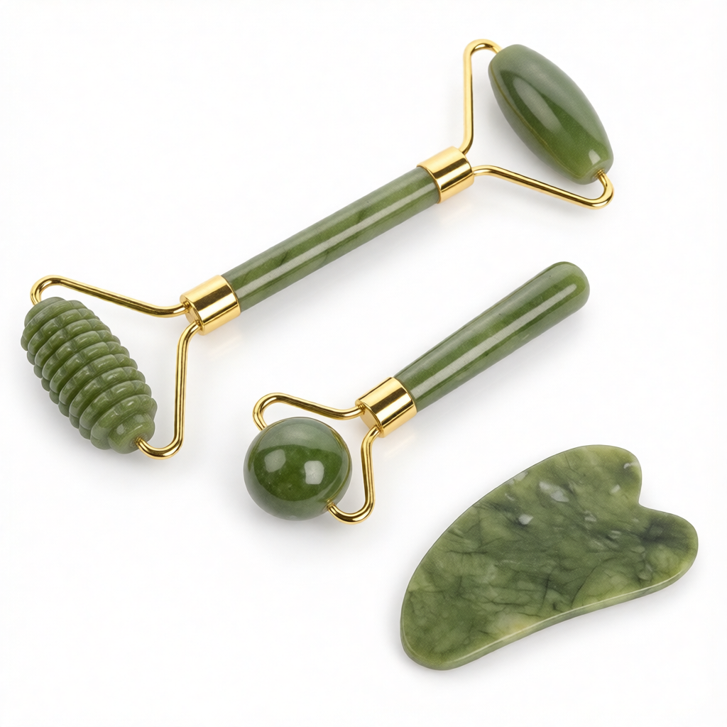 Массажный набор гуаша: 2 роллера (ролика) и скребок для лица из кварца Mizomed Trinity Harmony 3 в 1 зеленый (M31G)