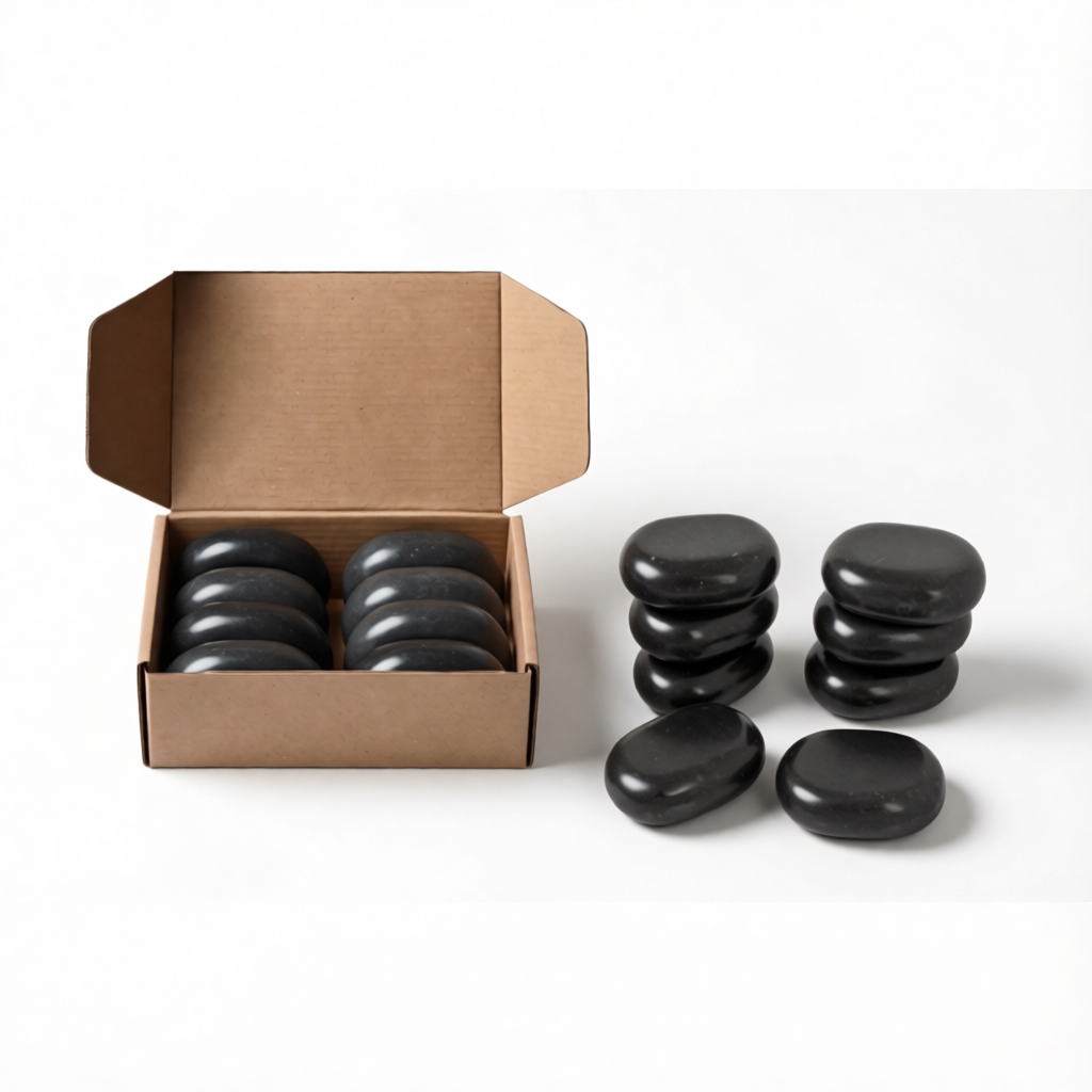Простой набор базальтовых камней, предназначенный для стоунтерапии и сеансов стоунмасажа.