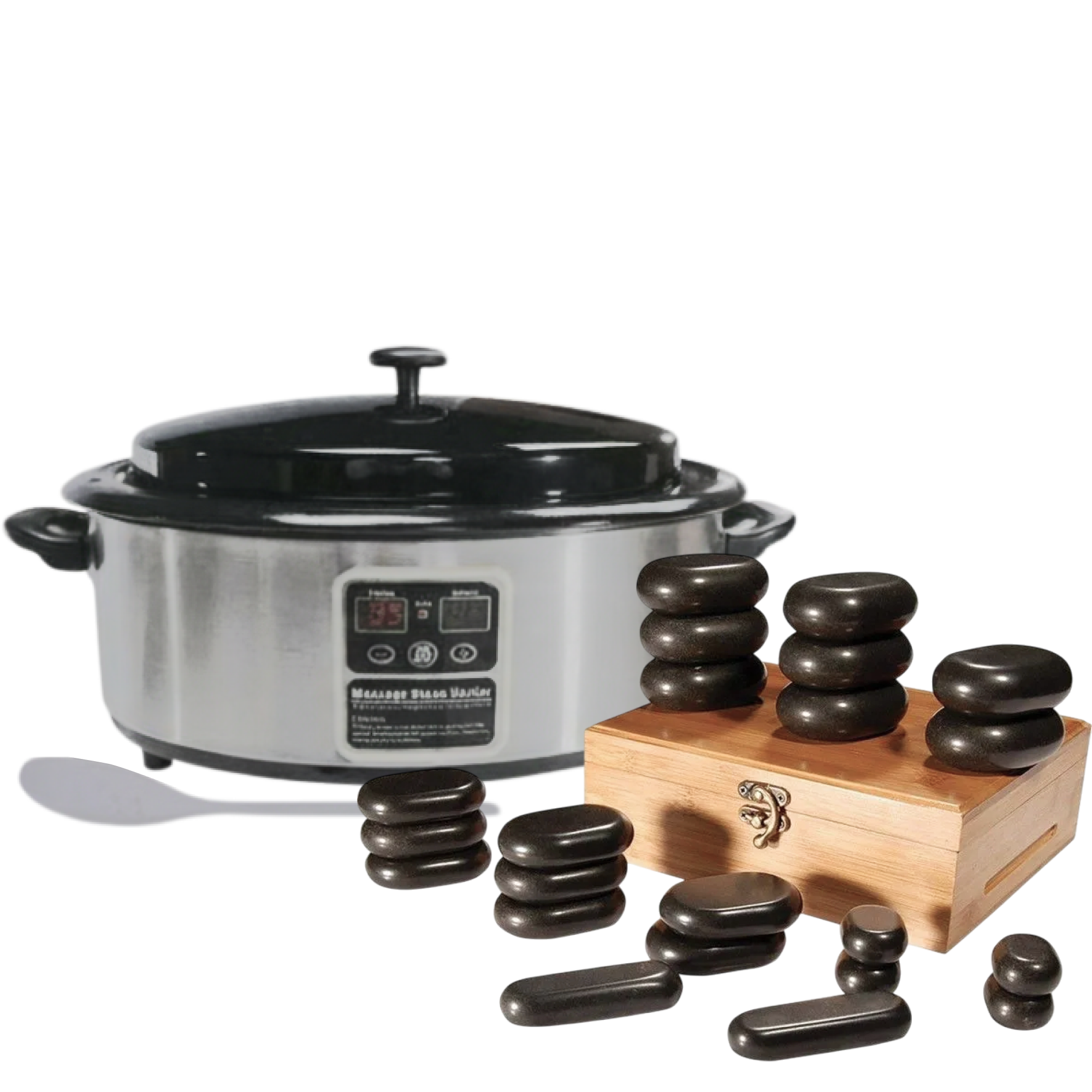 Нагреватель камней для стоун терапии Mizomed HSH6 + Набор массажных камней для стоун терапии из базальта Spastone H22TC в коробке из бамбука (22 шт.)