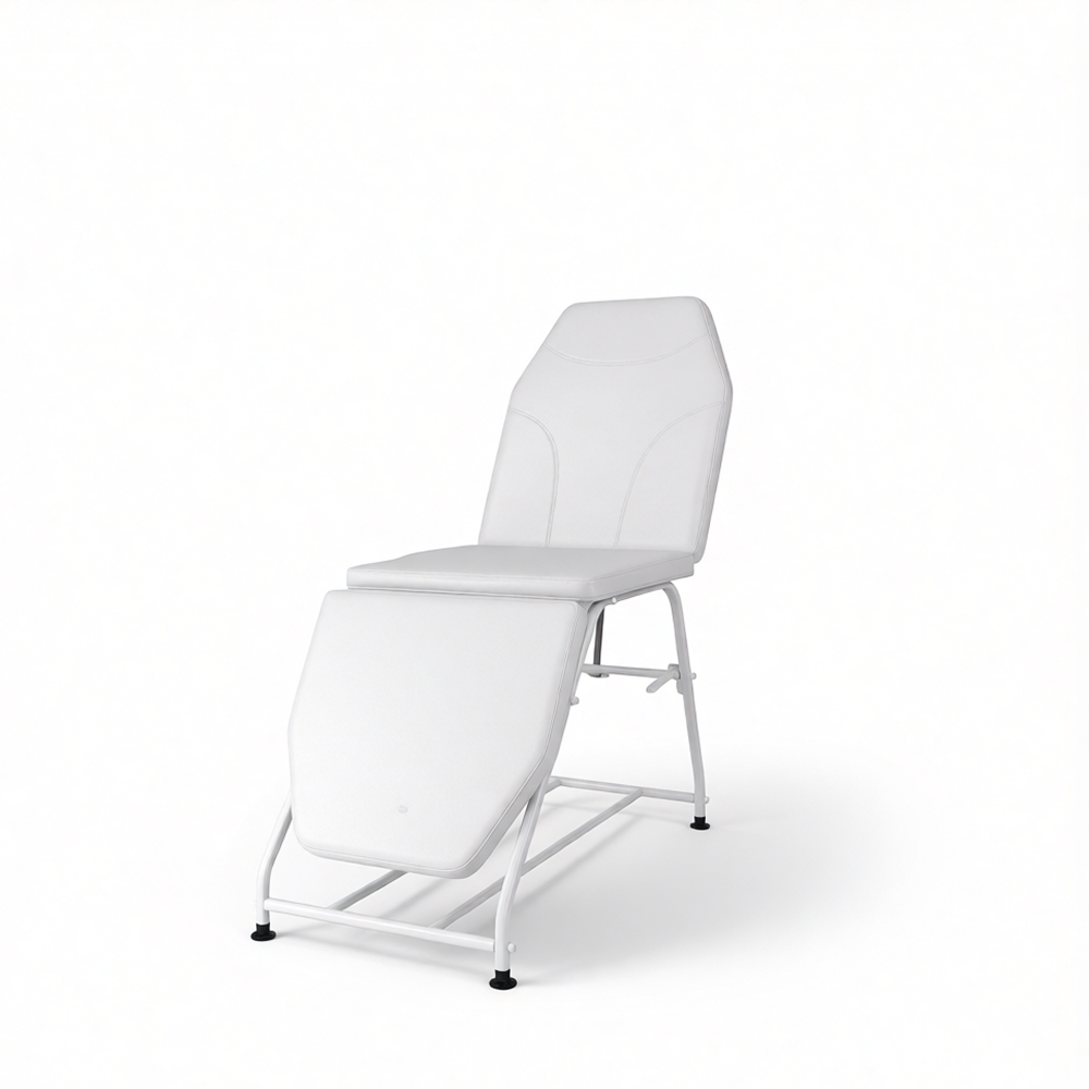 Кресло косметологическое стационарное на металлическом каркасе белого цвета. Раскладывается в горизонтальное положение, механическая регулировка спинки и ножной части.