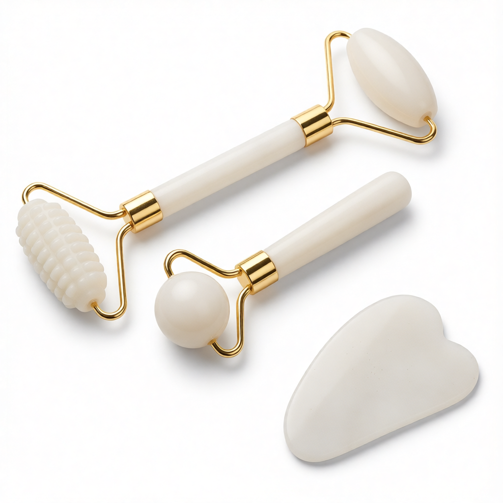 Массажный набор гуаша: 2 роллера (ролика) и скребок для лица из кварца Mizomed Trinity Harmony 3 в 1 белый (M31W)