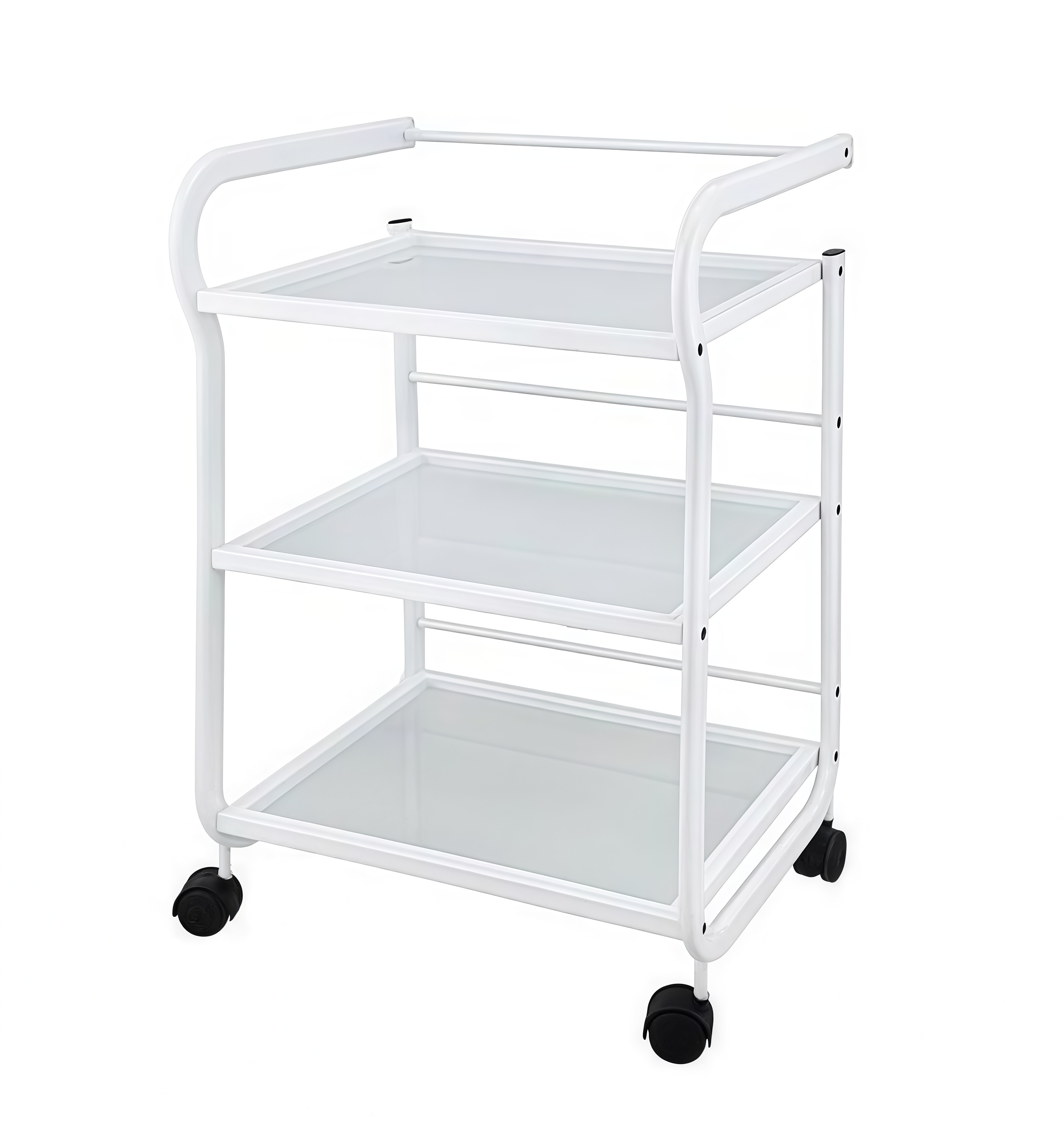 Столик данной модели в своей основе имеет прочный металлический каркас белого цвета, 3 открытые стеклянные полки из матового стекла, без дверок. На каждой из полок имеются небольшие (0.5см) бортики, которые помогают вещам оставаться на полке и не падать на пол. Данная модель имеет ручку для удобного перемещения тележки по кабинету.