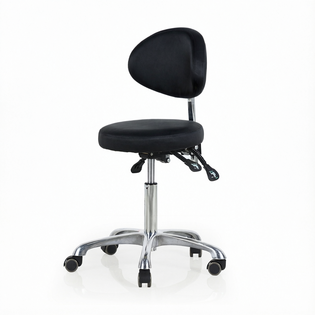 Стул для мастера со спинкой K65  - это универсальный стул, который является хитом продаж продолжительное время. Модель которая известна своим европейским качеством и доступной ценой. Стул поставляется на металлическом хромированном основании с колесиками. Имеется ручной пневматический подъемный механизм, с помощью которого регулируется высота стула. Благодаря изогнутой спинке кресла и удобному сидению стул оказывает поддержку поясницы и удобен в посадке.