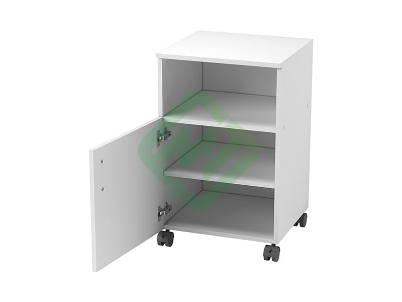 • Тумба на колесах, имеет нишу и отделение с распашной дверкой с углом открывания не менее 90º и съемной полкой с нагрузкой до 15 кг, размеры полки — 416x400x16 мм