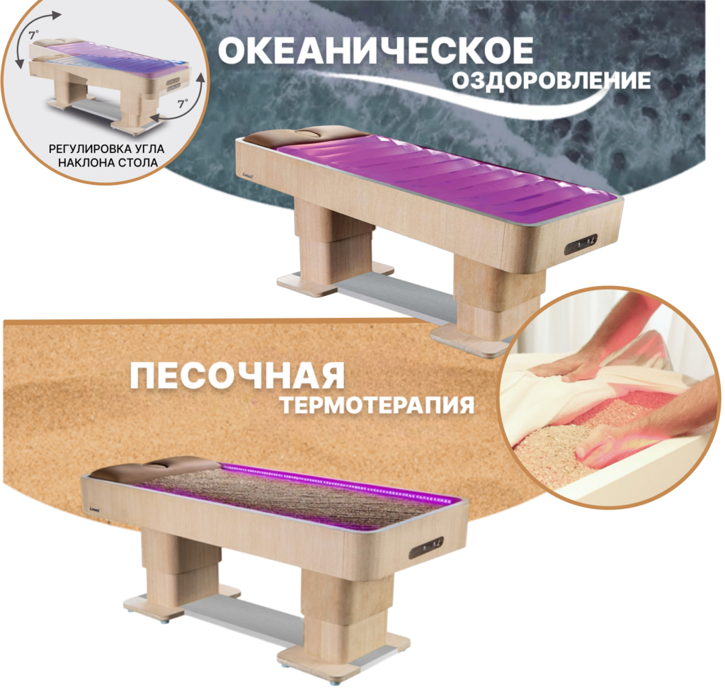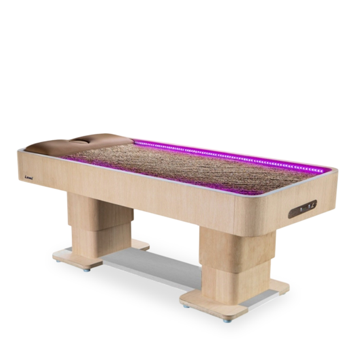 Массажный стол Spa Dream , оснащенный хромотерапией с 7 чередующимися цветами, устанавливается на регулируемом по высоте основании с возможностью наклона . Песочная версия изготовлена ​​из сферического кварца и при нагревании обволакивает тело, способствуя полному внутреннему расслаблению. Тепло «сухое», как на морском пляже, а размер зерен песка обеспечивает хорошую поддержку для массажа . В качестве альтернативы, подогреваемый водяной матрас состоит из 4 отдельных подушек для обеспечения оптимального распределения воды . Таким образом, поверхность стола чрезвычайно удобна для клиента и устойчива для мастера, который может выполнять все виды массажа, включая самые энергичные и локализованные.