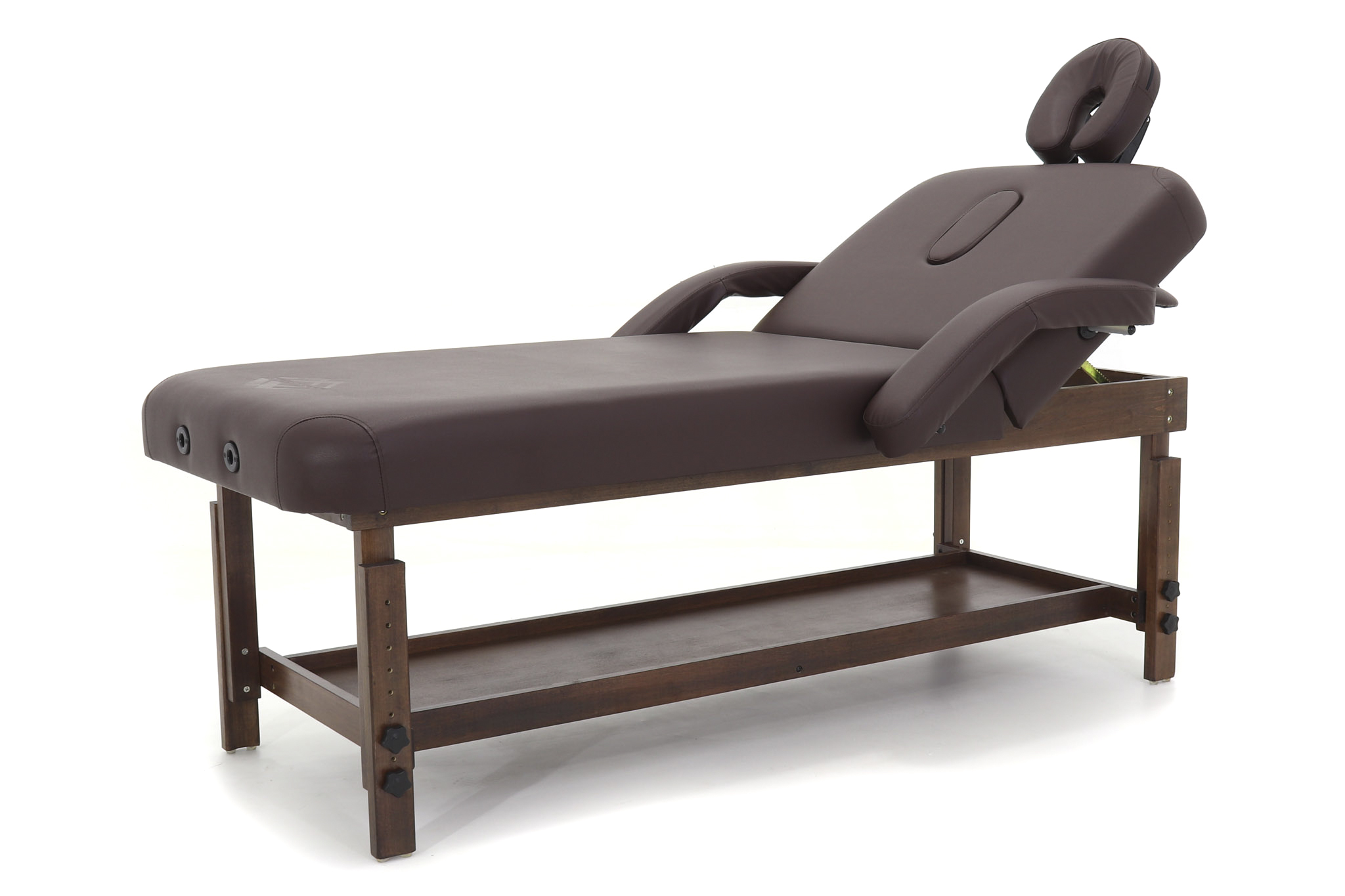 Рама стола изготовлена из натурального бука, ножки регулируются по высоте, а сам стол дополнен широкой полкой для полотенец и аксессуаров. Одна из секций имеет регулируемый угол наклона, который позволяет проводить большое количество лимфодренажных и вибрационных процедур. Подголовник регулируется по вылету и наклону, это позволит принимать пациентов с различным ростом.
