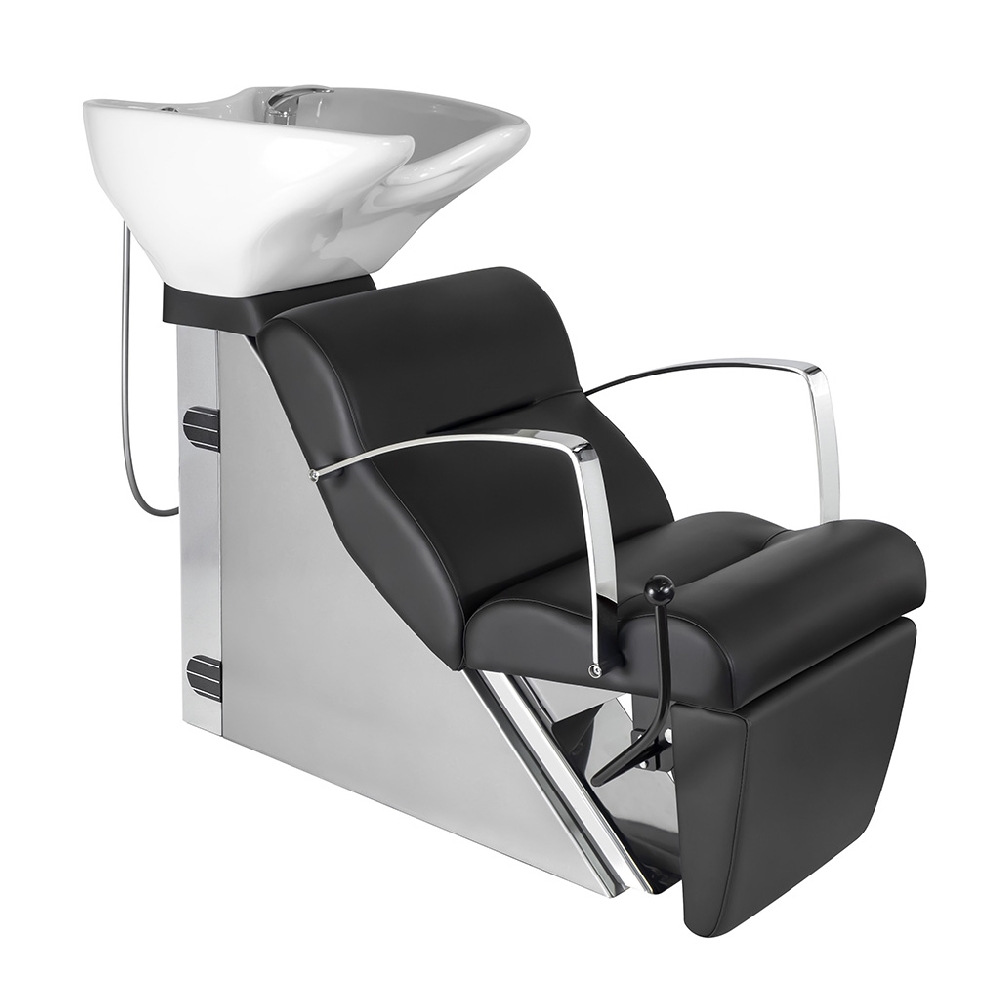 Мойка с каркасом из нержавеющей стали с серебряными или черными боками и креслом для клиента. Каркас кресла выполнен из высококачественного полиуретана. Кресло оснащено литыми алюминиевыми подлокотниками. Обивка - искусственная кожа высшего качества. Мойка комплектуется глубокой керамической раковиной с регулировкой угла наклона и комплектом смесителя.