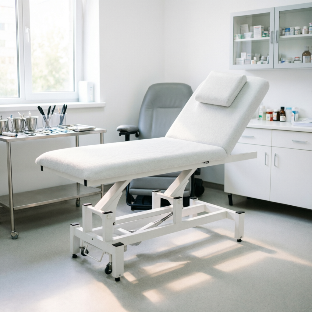 Электрическая кушетка. Один мотор для регулировки высоты, спинка регулируется механически. Подголовник с отверстием для лица.